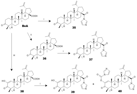 The new imidazole carbamate and N-acylimidazole derivatives 35–40 were synthesized from BoA (Scheme 9) and firstly, they were screened for in vitro cytotoxicity activity against human cancer cell lines [61]. Later, these imidazole analogues were also assessed against L. infantum promastigotes [62]. Compound 40 (IC50 = 25.8 µM), which has an additional imidazole carbamate at the C-2 position, was shown to be the most active analogue, and its antileishmanial activity was synergistically increased when 40 was associated with miltefosine, the medication used to treat leishmaniasis.