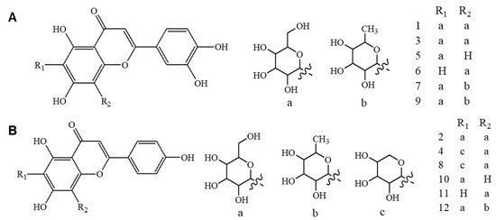 Chemical structures of luteolin derivatives (A) and apigenin derivatives in oil palm leaves (OPL) extract (B). Compound assignment: 1, luteolin-6,8-di-C-hexose (Isomer 1); 3, luteolin-6,8-di-C-hexose (Isomer 2); 5, isoorientin; 6, orientin; 7, luteolin-6-C-hexose-8-C-deoxyhexose (Isomer 1); 9, luteolin-6-C-hexose-8-C-deoxyhexose (Isomer 2); 2, apigenin-6,8-di-C-hexose; 4, apigenin-6-C-pentose-8-C-hexose (Isomer 1); 8, apigenin-6-C-pentose-8-C-hexose (Isomer 2); 10, vitexin; 11, isovitexin; and 12, apigenin-6-C-hexose-8-C-deoxyhexose.