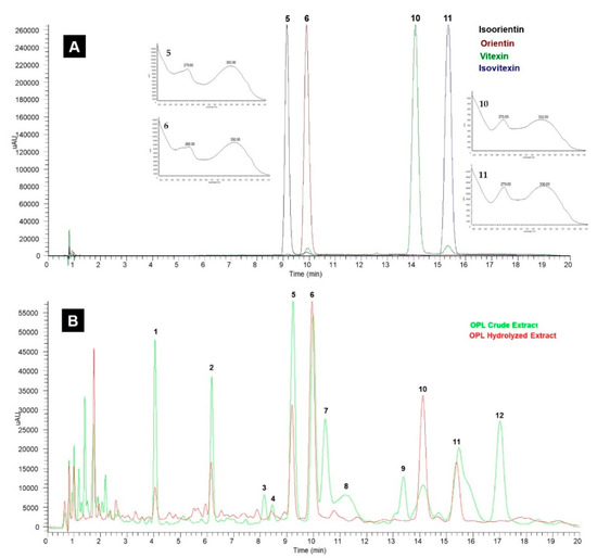 (A) Ultra-high-performance liquid chromatography-ultraviolet/photo-diode array (UHPLC-UV/PDA) chromatogram of commercial standards recorded at 340 nm: 5, isoorientin; 6, orientin; 10, vitexin; and 11, isovitexin. (B) Typical chromatogram of OPL crude and hydrolyzed extracts at 340 nm. Peak identified: 1, luteolin-6,8-di-C-hexose (Isomer 1); 2, apigenin-6,8-di-C-hexose; 3, luteolin-6,8-di-C-hexose (Isomer 2); 4, apigenin-6-C-pentose-8-C-hexose (Isomer 1); 5, isoorientin; 6, orientin; 7, luteolin-6-C-hexose-8-C-deoxyhexose (Isomer 1); 8, apigenin-6-C-pentose-8-C-hexose (Isomer 2); 9, luteolin-6-C-hexose-8-C-deoxyhexose (Isomer 2); 10, vitexin; 11, isovitexin; and 12, apigenin-6-C-hexose-8-C-deoxyhexose.
