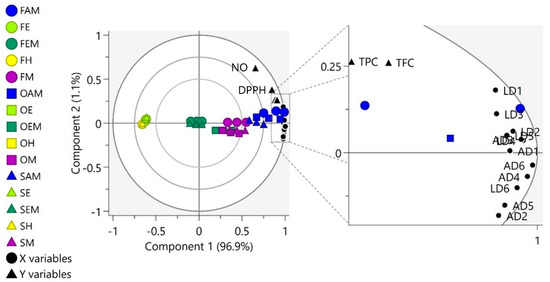 Biplot of the partial least square (PLS) model exhibiting correlation between relatively quantified luteolin and apigenin derivatives and antioxidant activity of OPL extracts obtained from various drying methods and extraction solvent systems. The ellipses (innermost to outermost) represent correlation-scaled loadings of values 0.50, 0.75, and 1.00, respectively. Abbreviations: F, freeze-dried; O, oven-dried; S, shade-dried; H, hexane; E, ethyl acetate; EM, ethyl acetate–methanol; M, absolute methanol; AM, aqueous methanol; TPC, total phenolic content; TFC, total flavonoid content; DPPH, 2,2-diphenyl-1-picrylhydrazyl; NO, nitric oxide; LD, luteolin derivatives; AD, apigenin derivatives; LD1, luteolin-6,8-di-C-hexose (Isomer 1); LD2, luteolin-6,8-di-C-hexose (Isomer 2); LD3, isoorientin; LD4, orientin; LD5, luteolin-6-C-hexose-8-C-deoxyhexose (Isomer 1); LD6, luteolin-6-C-hexose-8-C-deoxyhexose (Isomer 2); AD1, apigenin-6,8-di-C-hexose; AD2, apigenin-6-C-pentose-8-C-hexose (Isomer 1); AD3, apigenin-6-C-pentose-8-C-hexose (Isomer 2); AD4, vitexin; AD5, isovitexin; AD6, apigenin-6-C-hexose-8-C-deoxyhexose.