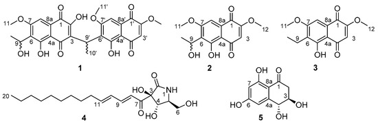 The isolation of 1 as a racemic mixture is not uncommon for this class of natural products [8,9]. To the best of our knowledge, this is the fourth example of an unusual class of natural products which contain two naphthoquinone subunits connected in a head-to-tail fashion by an ethylidene linker [7,8,9]. The known compounds were identified as 6-(1-hydroxyethyl)-2,7-dimethoxyjugalone (2) [10], 6-(1-ethyl)-2,7-dimethoxyjugalone (3) [10], pramanicin A (4) [11] and (3S,4S)-4-hydroxyscytalone (5) [8].