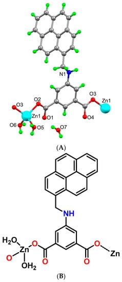 The asymmetric unit of the coordination polymer 1 contains one zinc(II) ion, one L2− ligand, two coordinated and one crystallization water molecules (Figure 3A,B). The Zn(II) center presents a distorted tetrahedral environment (τ4 = 0.91) [24], and via the deprotonated L2− ligand, it generates a 1D polymeric chain (Figure 3C). The metal ion binds two carboxylate oxygen atoms from two L2− units [Zn1-O2 2.007(17) Å and Zn1-O3 1.970(16) Å] and two water molecules [Zn1-O5 2.020(2) Å and Zn1-O6 2.025(2) Å]; the O–Zn–O bond angles fall within the range of 103.0(7)° to 119.7(9)°. The pyrene and isophthalate ring of the ligand are almost perpendicular with a dihedral angle of 73.34°. The observed non-planarity of the ligand is due to the relative twisting of the CH2-NH group, and the C4-N1-C9-C10 torsional angle is 163.21°. The carboxylate groups, working in a monodentate fashion, are nearly in the plane of the isophthalate ring (dihedral angles of 8.53° and 12.92°). The distance between two symmetry related Zn(II) ions in a chain is 10.239 Å, which is considerably larger than the shortest intermolecular distance of 5.412 Å between two metal ions in vicinal chains.
