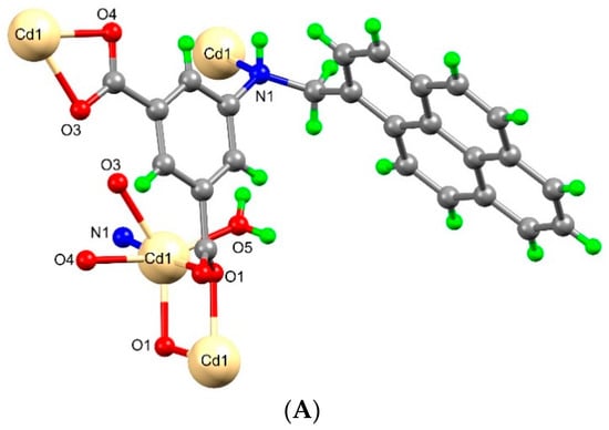 The asymmetric unit of [Cd(μ4-1κO1O2:2κN:3,4κO3-L)(H2O)]n·n(H2O) (2) contains one Cd(II) ion, one L2− ligand and one of each coordinated and non-coordinated water molecules (Figure 4A,B). The distorted octahedral coordination environment of Cd(II) ion is occupied by four carboxylate-O from three adjacent L2− ligands [Cd1-O1 2.228(2), Cd1-O1′ 2.451(3), Cd1-O3 2.343(2), Cd1-O4 2.401(3)] and one amine NH from a L2− ligand [Cd1-N1 2.470(3)], and the remaining site is engaged with the water molecule [Cd1-O5 2.190(3)]. The O–Cd–O bond angles are within the range of 54.45(9)° to 173.60(9)°. In this coordination polymer, the amine NH participates in the metal coordination, which we have not observed in other coordination polymers. The deprotonated L2− ligand coordinates simultaneously to four metal ions, with two of them linked by a bridging-chelate carboxylate group, another one where carboxylate is in a chelate-monodentate mode, and the remaining one by the amine NH group.
