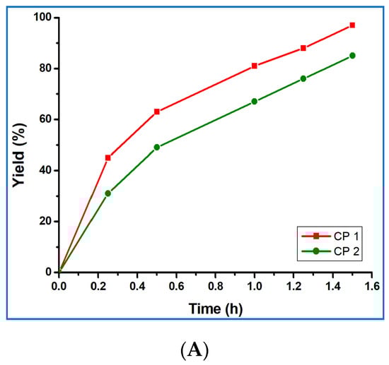 To check the leaching and heterogeneity of our catalysts, we separated the catalyst by centrifugation after 0.5 h and kept the catalyst-free reaction mixture under the same environment for 1 h more. After elimination of the solid catalyst 1 or 2 from the reaction mixture, no perceptible rise in the yield was observed (Figure 6A, blue and green dotted lines), which substantiates the absence of leaching and the heterogeneous nature of the catalyst. FTIR and powder X-ray diffraction analyses of the catalyst before and after the catalysis reaction were performed, to check the structural integrity of our catalysts 1 and 2, and no significant changes in their patterns were observed, as shown in Supplementary Materials Figure S2 and S3. These results support that the structures of the catalysts 1 and 2 remain intact after the catalytic reaction.