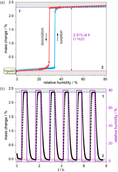 But the humidity-driven structural transformation from 1 to 2 appears at a lower RH value. This results in the appearance of a humidity-oriented hysteresis loop. Upon decreasing the humidity, sorption and desorption curves follow the same trend in the 80–38% RH range but, then, the sample remains in phase 1 down to 29% where the water excess is removed in an almost one abrupt step. Symmetrically to the hydration process, the desorption curve indicates full structural conversion to 2 with a visible shift down to ca. 24%, which is followed by the recreation of an initial sorption step. Besides the sorption/desorption isothermal experiment, several cycles of hydration and dehydration of the sample in the 0–80% range were performed proving the perfect reversibility of the sorption-related processes (Figure 2b).