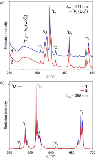 Room-temperature emission properties of 1 and 2. Excitation spectra monitored at λem = 611 nm (a), and emission spectra measured under irradiation with λexc = 395 nm (b). The main electronic transitions are assigned in the figure.