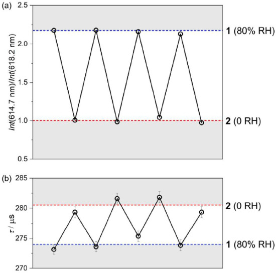 Repeatability of the emission signal in the subsequent dehydration/hydration cycles, performed at room temperature, presented using the intensity ratio between the emission maxima located at 614.7 and 618.2 nm (a) and using the values of the extracted emission lifetimes (b). The related emission decay profiles were presented in Figure S8 in the Supplementary Materials. Blue and red dashed lines indicate 0 and 80% relative humidity values, respectively.