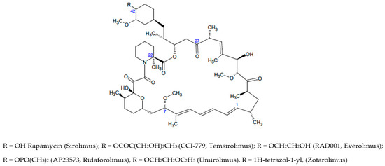 - Luengo, J.I.; Yamashita, D.S.; Dunnington, D.; Beck, A.K.; Rozamus, L.W.; Yen, H.K.; Bossard, M.J.; Levy, M.A.; Hand, A.; Newman-Tarr, T.; et al. Structure-activity studies of rapamycin analogs: Evidence that the C-7 methoxy group is part of the effector domain and positioned at the FKBP12-FRAP interface. Chem. Biol. 1995, 2, 471–481. [Google Scholar] [CrossRef][Green Version]
