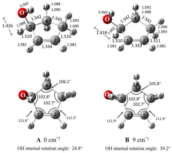 The six conformers of 2CPOL with energy minima on the PES result from different values of the ring-puckering coordinate and the internal rotation angle of the OH group. Table 1 presents the key features of these conformations. Figure 1 shows the atomic numbering and the geometrical parameters calculated for the two lowest energy conformers. The lowest energy conformation A clearly possesses π-type hydrogen bonding as the calculated distance from the hydrogen atom on the OH group to the middle of the C=C double bond is 2.68 Å. This is very similar to the distance of 2.75 Å for 3-cyclopenten-1ol (II) and for other cyclic alcohols with this type of π bonding as shown in Table 2. The conformers A and B differ by having carbon atom 4 puckered in opposite directions. According to the CCSD/cc-pVTZ computations, B is only 9 cm−1 higher in energy from A, whereas the other conformers are 293 to 361 cm−1 higher in energy. MP2/cc-pVTZ computations predict B to be 89 cm−1 higher in energy. For B, the calculated distance from the hydrogen atom on the OH group to the middle of the C=C double bond is 3.00 Å, and this is considerably longer than that in the other molecules shown in Table 2, suggesting that the π type hydrogen bonding, if present, is quite small. On the other hand, as discussed below, the calculated and observed O-H stretching frequencies for A and B are both considerably lower than for the other conformers, and this would result from the hydrogen bonding. Figure 2 shows all six calculated structures for the conformational minima. Table 1 presents the ring-puckering angles and OH internal rotation angles, the calculated energy differences, and the calculated relative populations of the six conformers of 2CPOL at 25 °C. Supplementary Table S1 presents the calculated structural parameters for all six conformers from our CCSD/cc-pVTZ computations. Table 1 and Table S1 also show the calculated distances from the hydrogen atoms of the OH group to the center of the C=C bond.