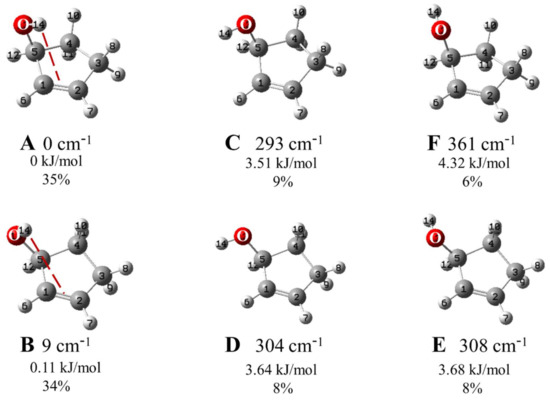 As can be seen in Table 1, the absolute value of the ring-puckering angle is 22° ± 2° for each of the conformers. Thus, the conformational energy differences arise primarily from the internal rotation of the OH group. Conformers A and B differ by about 14° of the OH internal rotational angle, and both may allow the intramolecular hydrogen bonding to occur. However, the A conformer is lower in energy and has a stronger hydrogen bond as reflected by the shorter distance from the OH hydrogen to the center of the C=C bond. For conformer A, this distance is 2.682 Å, whereas for the conformers without hydrogen bonding, the distances are at least 0.3 Å longer.