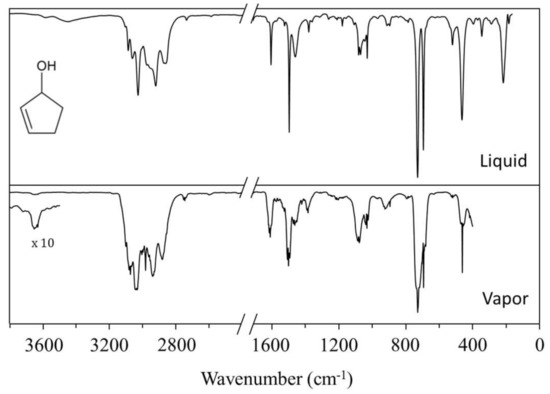 Figure 3 shows a comparison of the experimental liquid phase and vapor-phase infrared spectra. Since intermolecular hydrogen bonding will be much stronger in the liquid phase than the intramolecular hydrogen bonding, bands corresponding to the specific A, B, C, D, E, and F conformers will not be present in the liquid spectra. Table 3 shows the observed vapor-phase and calculated frequencies for selected vibrations of the A conformer of 2CPOL compared to those observed for the related molecules 3-cyclopentenol (II) [9], 3-cyclopenten-1-amine (VII) [13], and cyclopentene [24].