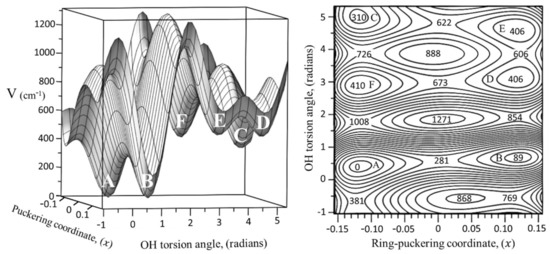 Figure 6 shows the calculated potential energy surface (PES) for 2CPOL in terms of its ring-puckering and OH internal rotation coordinates. This PES was generated by individually computing the energies of more than 150 conformations of 2CPOL using MP2/cc-pVTZ calculations. CCSD/cc-pVTZ calculations for so many conformations would have taken an inordinate amount of computer time. The zero value of the OH internal rotation angle is defined at the position where the hydrogen atom of the hydroxyl group OH points toward the center of the C=C double bond. The PES clearly shows the presence of the six different minima which reside at six different conformational energies. The mathematical function that best satisfies the fit of the calculated data has the form: