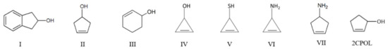 For many years, our research group has focused on utilizing both experiment and theory to develop a more comprehensive understanding of one-dimensional vibrational potential energy functions (PEFs) and two-dimensional potential energy surfaces (PESs) [1,2,3,4,5,6,7]. In particular, we have investigated the PEFs and PESs which govern the conformational dynamics of small ring molecules as well as those governing internal rotations. In recent years, we have applied our expertise to investigating cyclic molecules that possess intramolecular π-type hydrogen bonding. Among the molecules which we studied are 2-indanol (I) [8], 3-cyclopenten-1-ol (II) [9,10], 2-cyclohexen-1-ol (III) [11], 2-cyclopropen-1-ol (IV) [12], 2-cyclopropen-1-thiol (V) [12], 2-cyclopropen-1-amine (VI) [12], and 3-cyclopenten-1-amine (VII) [13]. These molecules are shown in Scheme 1.