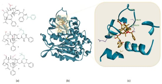 (a) Chemical structures of (1) paclitaxel, (2) docetaxel, and (3) cabazitaxel, major structural differences are highlighted in green while alkylation/acylation of OH groups is highlighted in red; (b) 3D structure of stabilized microtubule chain A (blue) (PDB ID: 5SYF) in complex with taxol (gold) and (c) important HBs (green dotted lines) formed by the taxane structure within the β-tubulin binding site. Protein-ligand representation was achieved using Biovia Discovery Studio 4.1 (Dassault Systems).