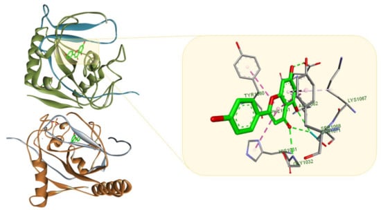 Apigenin (light green) in in complex with TNK2 (PDB ID: 4HKK); the flavone interacts with the surrounding amino acid residues through multiple HBs (green dotted lines) and several hydrophobic interactions (purple dotted lines). Protein-ligand representation was achieved using Biovia Discovery Studio 4.1 (Dassault Systems).