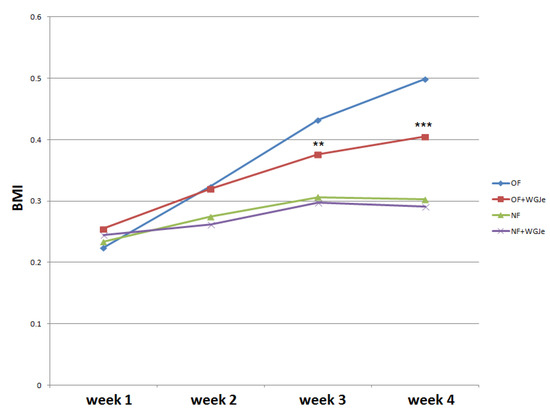 The experimental period lasted four weeks. Statistical analysis was performed to evaluate BMI variation among the four experimental groups, and a clear increase of BMI was observed in both treated (overfed (OF) + WGJe) and untreated OF groups with respect to normally fed (NF) ones, noticeable already after 2 weeks of treatment (Figure 2). However, the significant decrease of the BMI of the OF + WGJe group compared to that of the OF one between the third and fourth weeks of treatment (p < 0.01 and p < 0.001, respectively) indicated the specific role of WGJe supplementation in the control of metabolism. No statistically significant difference between treated and untreated NF groups was recorded during the experimental period (Figure 2).