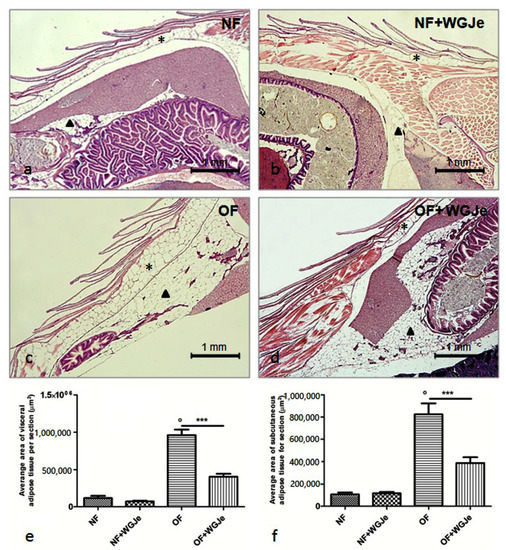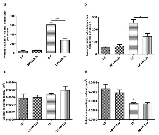 Furthermore, despite the higher visceral adipocyte density in the OF + WGJe group compared to the OF group, no significant difference was appreciated between both groups (Figure 5c). The density of subcutaneous adipocytes (Figure 5d) did not show any statistically significant difference between treated and untreated groups for both the NF and OF groups.