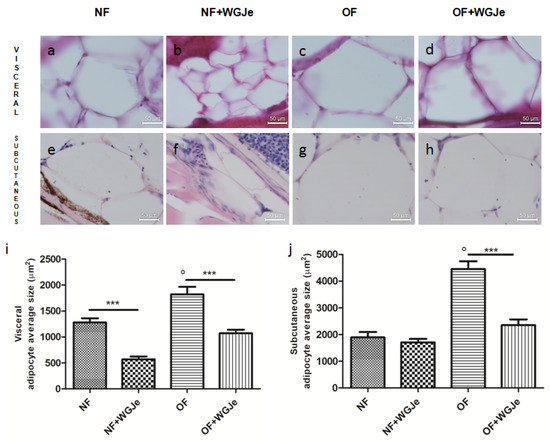 Differences in visceral and subcutaneous adipocytes size were observed among experimental groups. The adipocytes size in all the fat accumulation areas was significantly increased in the OF group vs. the NF group (p < 0.001; Figure 4a,c,e,g,i,j). Additionally, the treatment of WGJe in the OF group had halved (p < 0.001) the size of the subcutaneous and visceral adipocytes with respect to the OF alone group (Figure 4d,h,i,j). Statistically significant differences among the NF vs. the NF + WGJe groups were registered only in visceral adipose tissue (p < 0.001; Figure 4i).