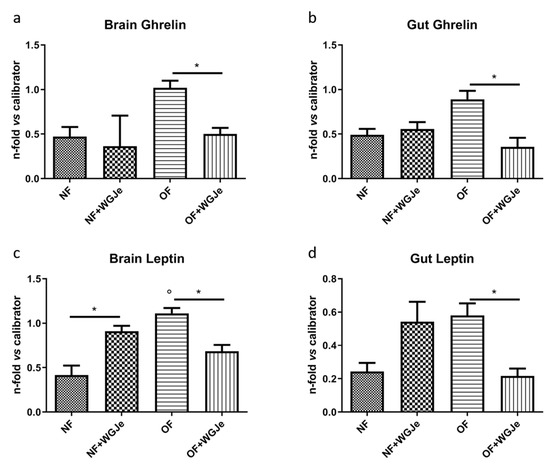 We analyzed the anti-obesity effects of WGJe on the expression levels of two hormones involved in food intake regulation: ghrelin, an appetite-stimulating hormone, and leptin, an anorexigenic one. Therefore, ghrelin and leptin mRNA levels were investigated by real-time PCR (qPCR) using an arbitrary calibrator in both the brain and gut of the NF and OF groups, with and without WGJe treatment (Figure 6). In the brain, ghrelin expression levels were higher in the OF compared to the control group (NF) (p < 0.05; Figure 6a). The administration of WGJe extract showed a significant reduction of ghrelin mRNA expression levels in the OF + WGJe group compared to the OF group (p < 0.05; Figure 6a). Similarly, WGJe extract was able to reduce ghrelin mRNA expression significantly in the gut of the OF + WGJe group compared to the untreated counterparts (OF) (p < 0.05; Figure 6b). The analysis carried out for leptin showed significantly higher levels in OF compared to the NF group in both brain and gut (p < 0.01 and p < 0.05, respectively; Figure 6c,d). The treatment with WGJe extract significantly decreased the leptin mRNA level in both the brain and gut of overfed (OF + WGJe) compared to the untreated group (OF) (p < 0.05; Figure 6c,d).