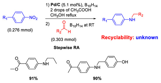 The modern revaluation for the employment of heterogeneous catalysis for carrying out RA of aldehydes with nitroarenes started only in the 2000 s with the use of commercial source of palladium catalyst (Pd/C). In fact, Yoon and co-workers reported that Pd/C promoted the conversion of nitroaromatics and aldehydes into N-alkylaminoaromatics employing decaborane (B10H14) as a reducing agent (Scheme 4) [43].