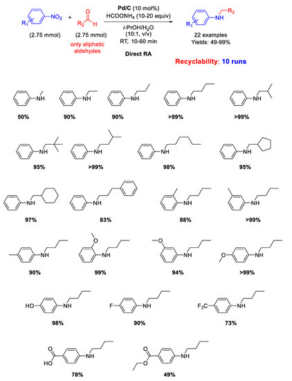 In 2007, Rhee and co-workers proposed another protocol for DRA accelerated by Pd/C [45]. Twenty-two mono-N-alkylation of anilines in moderate to excellent yield (49%–99%) were obtained at room temperature by starting from nitroarenes and aliphatic aldehydes in aqueous 2-propanol solvent with ammonium formate (HCOONH4), as in situ hydrogen donor (Scheme 5). Moreover, it was demonstrated that Pd/C catalyst could be reused for 10 cycles. The proposed protocol, although facile and environmentally benign, is unfortunately not applicable to aromatic aldehydes.