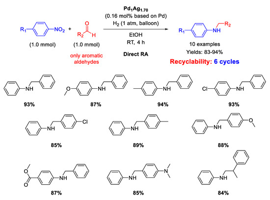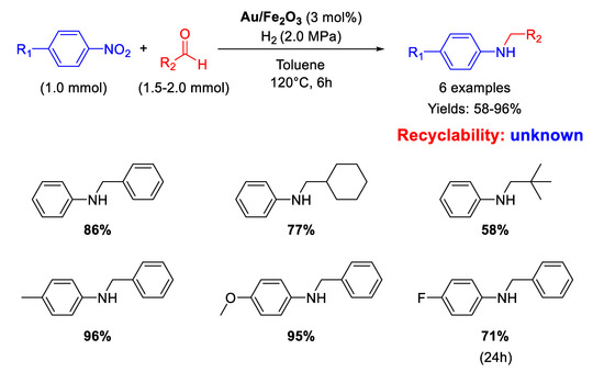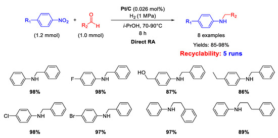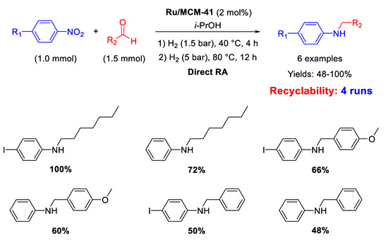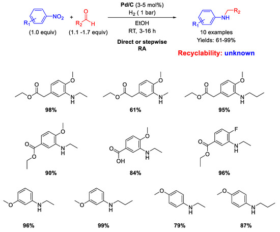 In the last two decades, several efforts have been addressed to develop an efficient heterogeneous catalytic system for this tandem reaction, that could be carried out in a direct way or stepwise, starting from nitroaromatics and aldehydes in the presence of supported metal catalysts, mainly nanostructured, or bimetals with a reducing agent. Indeed, nowadays, a central issue in contemporary synthetic organic chemistry is developing economically efficient and environmentally sustainable processes, and one of the best and widest approaches for reaching these objectives is the one-pot synthesis of a target molecule in the same reaction vessel, preferably facilitated by a recyclable heterogeneous catalyst [20,21]. The heterogeneous catalytic one-pot synthesis of secondary anilines by RA starting from nitroarenes and aldehydes is a clear example of this approach.