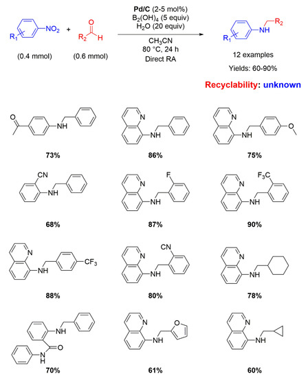 Nine years later, Pd/C has been employed again as catalyst for RA, but this time in the direct (not stepwise) fashion. Indeed, Zhou and co-workers used water (20 equiv.) as the hydrogen source mediated by diboronic acid (B2(OH)4 5 equiv.) in acetonitrile at 80° for 24 h for reacting various nitroarenes with different aromatic and aliphatic aldehydes, affording yields ranging from 60 to 90% (Scheme 8) [49]. The yields were higher when the substituent in the benzaldehyde ring was electron withdrawing. The role of water as hydrogen donor was verified by using D2O as transfer agent. No recyclability studies on the catalytic system have been carried out.