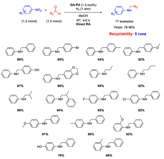 Another important kind of palladium-based heterogeneous catalysts effective for RA is constituted by Pd NPs supported onto organic naturally derived matrices. Pd NPs supported on Gum-Acacia colloids (GA-Pd) have been reported by Sreedhar and co-workers for successful Pd-catalysed DRA applied to both aromatic and aliphatic aldehydes [50]. The supported Pd NPs with a narrow size distribution (ranging from 6 to 12 nm) resulted active and selective towards the formation of secondary anilines for at least five subsequent cycles at room temperature, in methanol solvent, using 1 atm dihydrogen as the reductant (Scheme 9). The yields were quite high (76–96%).