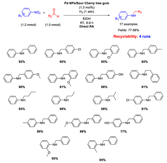 A similar catalyst has been prepared by Nasrollahzadeh, that reported on the synthesis of Pd nanoparticles, with size ranging from 2.5 to 15 nm, stabilized on the surface of Sour Cherry tree gum and their use in catalysis for the direct one-pot RA in ethanol at room temperature under 1 atm H2 [51]. The catalytic system was active, selective, and recyclable for up to four subsequent runs (Scheme 10).