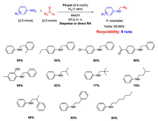 Dell’Anna and co-workers reported the catalytic activity and recyclability of polymer supported Pd nanoparticles (Pd-pol) obtained by copolymerization of Pd(AAEMA)2 [AAEMA− = deprotonated form of 2-(acetoacetoxy) ethyl methacrylate] with methacrylic comonomers, followed by reduction under reaction conditions [53]. Pd-pol also proved to accelerate other kinds of chemical reactions such as reductions, oxidations and esterification. [54,55,56,57,58,59] However, the Pd-pol catalysed reductive amination was successful in one step by using aliphatic aldehydes only. In fact, when benzaldehydes were employed, the one-pot reaction was carried out in three steps to avoid benzyl alcohol formation (Scheme 11). The catalytically active species were in situ formed Pd NPs with a narrow size distribution centred at 5 nm in diameter, whose morphology remained almost unchanged during reaction. The catalyst resulted recyclable for at least eight subsequent runs without loss of activity and selectivity. The catalytic reactions were performed under mild conditions (1 atm H2, room temperature, methanol as the solvent) by using equimolar amounts of nitroarene and aldehyde.
