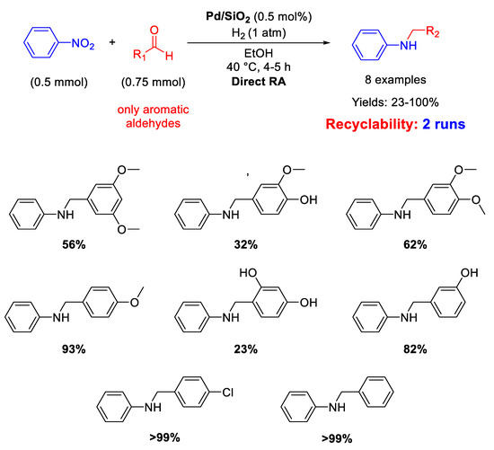 Pd NPs dispersed onto inorganic supports, such as silica and zeolite, have been successfully used as catalysts for DRA. In details, Ma and co-workers reported that SiO2 supported Pd nanoparticles with a mean diameter of 5 ± 2 nm were active and selective in the one-pot DRA starting from benzaldehydes and nitroarenes under H2, at 40 °C in ethanol (Scheme 12) [60]. The catalytic system gave poor yield (23%) in the desired product, when the benzaldehyde had a substituent in ortho position, due to steric hindrance. The catalyst was recyclable for at least two subsequent runs.