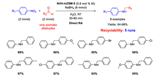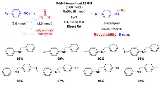 On the other hand, in 2016, Pd NPs incorporated in ZSM-5 zeolite (ZSM-5 = Zeolite Socony Mobil–5) with a hierarchical structure (Pd/H-hierarchical ZSM-5) have been found effective catalyst for DRA starting from nitroarene compounds, using aldehyde in the presence of NaBH4 as a reducing agent (molar ratio of reductant/substrate = 3) and water as the solvent at room temperature (Scheme 13) [61]. Transmission Electron Microscopy (TEM) images showed the formation of an ordered mesostructure in H-hierarchical ZSM-5, supporting Pd NPs with an average diameter of 3–6 nm dispersed in the matrix. The activity of the catalyst was quite high, reaching excellent yields (92%–98%) in short time (10–35 min). Recyclability tests demonstrated that after 6 runs with the same catalyst, the yield into the secondary amine passed from 98% (1st run) to 82% (6th run), and a slight palladium leaching into solution was observed. However, the very interesting aspect of this catalytic system stands in both the use of water as the solvent (which notoriously inhibits the imine formation via condensation of aniline and carbonyl group) and the employing of NaBH4 as the reductant, that normally quickly reduces the C=O polar double bond of the aldehyde, even in the absence of metal catalyst, thus subtracting aldehyde for the condensation step reaction. The acid sites and the mesoporous structure of the hierarchical zeolite allowed to overcome all problems associated with the use of water and NaBH4. In addition, the authors observed that the reaction rate increased when an electron-withdrawing group was located on the nitroaromatic ring (because the tendency of nitro groups to accept hydride ions increased), or when an electron-donating group was placed on the benzaldehyde ring (because the electron donating group stabilized the protonated carbonyl bond intermediate).