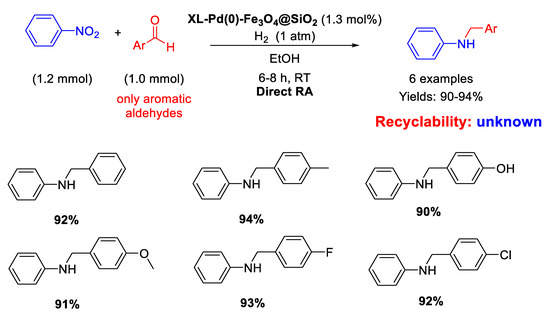 In 2014, following their study on Pd nanoparticles supported onto magnetite seeds, Li and Ma and co-workers synthesized with the reverse microemulsion method uncommon nano-catalysts constituted by Fe3O4@SiO2 core-shell nanospheres of 35 nm in size, which were functionalized with ethylenediamine groups in turn reacted with succinyl chloride to support Pd NPs of 5 nm in diameter, homogeneously distributed onto the external matrix surface (XL-Pd(0)–Fe3O4@SiO2) [63]. These nano-catalysts resulted active and selective in the DRA at room temperature in ethanol under 1 atm H2 starting from nitrobenzene with various benzaldehydes (Scheme 15). The catalyst was easily recovered at the end of the reaction for further re-uses. The authors noticed that the presence of an electron withdrawing group in para- position in the aldehyde ring caused a reduction in the reaction time, while the presence of an electron donating group led to increased reaction times, according to the mechanism proposed in Scheme 3.