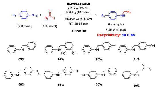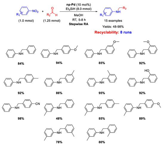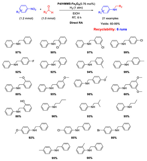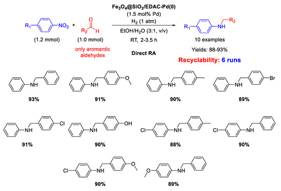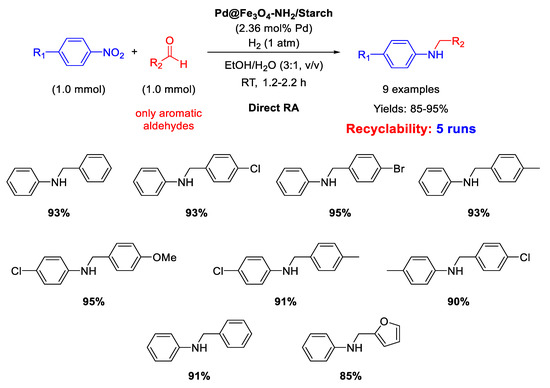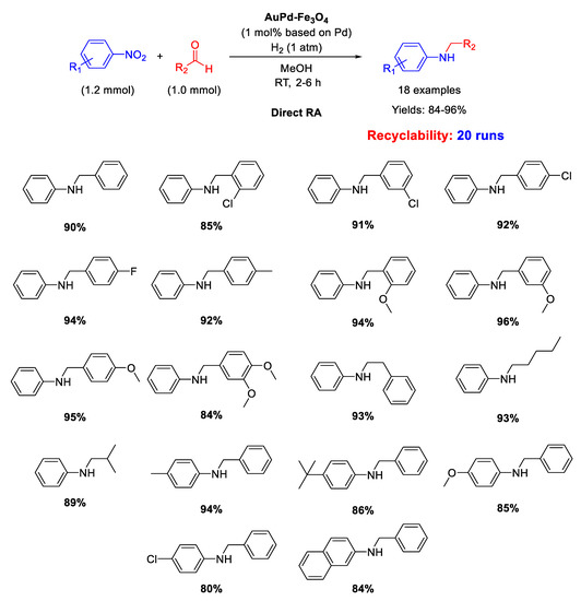 Ma research group reported on the synthesis of Pd/Fe3O4 nanocomposites constituted by Pd NPs of 3 nm ca. in size dispersed onto magnetite NPs with an average size of 20 nm [62]. These interesting nano-catalysts were able to catalyze the DRA between benzaldehyde and various nitrobenzenes under hydrogen (1 atm) at room temperature (Scheme 14). Ethanol and methanol were both good solvents, but EtOH was preferred to MeOH from the environmental point of view. The catalyst was easily removed from the reaction mixture thanks to its magnetic features, and then recycled for up eight times without loss of activity and selectivity.