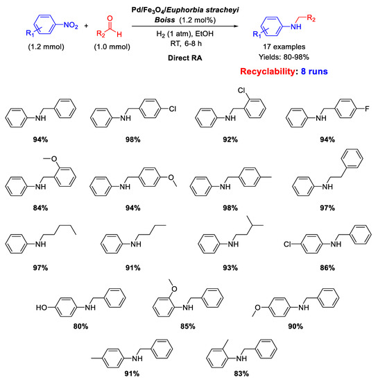In the framework of Pd/Fe3O4 nanocomposites as efficient catalysts for DRA reaction, Nasrollahzadeh’s group reported on the synthesis, characterization, and catalytic activity of palladium and magnetite NPs supported on Euphorbia stracheyi Boiss root extract [68]. FESEM micrographs of the catalyst showed that Fe3O4 and Pd NPs were homogeneously distributed, and TEM images revealed that the obtained nanoparticles had spherical shape with an average diameter of 10 nm. The catalytic system was tested in the DRA of various nitroarenes with benzaldehyde and in the reaction between nitrobenzene with differently substituted benzaldehydes, in ethanol, at room temperature, under 1 atm H2, affording good (80%) to excellent (98%) yields in the target product (Scheme 20). Recyclability experiments demonstrated that the catalyst could be easily recovered at the end of reaction thanks to its magnetic properties and could be re-used for at least 8 runs without loss of activity.