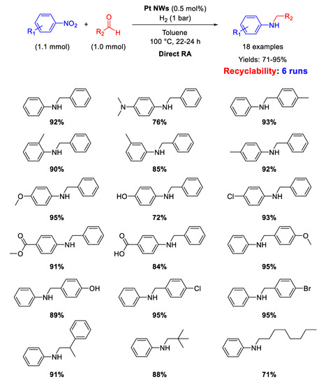 Few examples have been reported in recent years in the field of RA catalyzed by platinum-based catalysts. Among them, Lu and Gu and co-workers [70] proposed the use of ultrathin Pt nanowires (Pt NWs) as catalyst for DRA starting from various nitroarenes with different benzaldehydes under 1 atm H2, in toluene, at T = 100 °C. The yields in the desired products were quite high, reaching the value of 95% in some cases (Scheme 22). Recyclability tests demonstrated that the catalyst could be recycled for 6 runs, without losing activity and selectivity. TEM analyses showed that Pt NWs were several hundred nm long and had an average diameter of 2 nm. On the base of GC analyses and DFT calculations, the authors proposed an unusual mechanism pathway for the DRA with their catalytic system. Since Pt catalysts (like Pd catalysts) reduce nitroarenes following the direct route reported in Scheme 2, the authors claimed that, in the presence of Pt NWs under H2, the hydroxylamine intermediate (see Scheme 2) directly reacts with the carbonyl group of the aldehyde before converting into aniline. In this way, the N-substituted secondary aniline would be obtained without passing throughout the formation of imine.