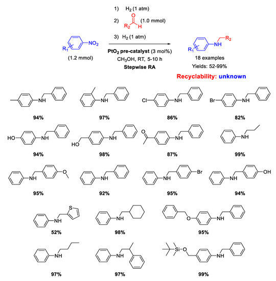 Shreedar and coworker [71], following their study on precious metal catalyzed RA, employed PtO2 as pre-catalyst for the stepwise RA starting from various nitrobenzenes, that were first converted into anilines and then condensed with benzaldehydes to give imines. At the end, the imines were hydrogenated to obtain the target product in one-pot three-step way. The overall reaction occurred in methanol at room temperature, by putting the system under 1 atm of H2 only in the first and in the third step. The catalytically active species were Pt particles suspended in the reaction medium, obtained by preliminary H2 reduction of PtO2 suspended in methanol.