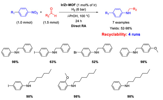 - Sui, D.; Mao, F.; Fan, H.; Qi, Z.; Huang, J. General Reductive Amination of Aldehydes and Ketones with Amines and Ni-troaromatics under H2 by Recyclable Iridium Catalysts. Chin. J. Chem. 2017, 35, 1371–1377. [Google Scholar] [CrossRef]