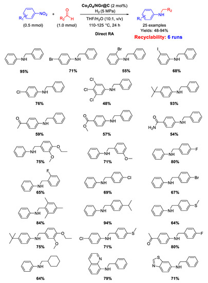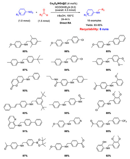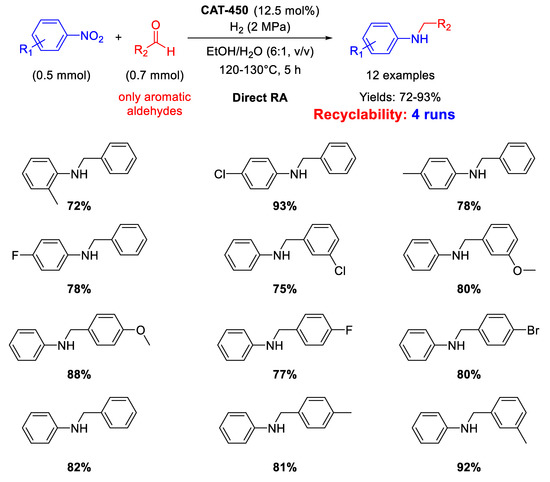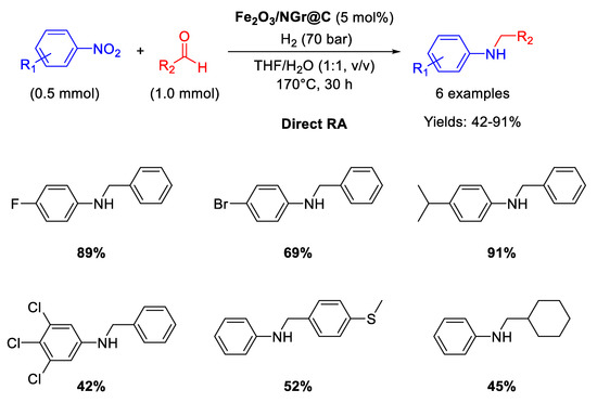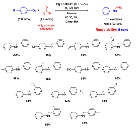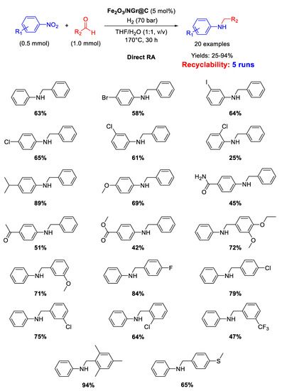 Secondary amines occupy a paramount role as intermediates and building blocks for the production of numerous agrochemicals, detergents, drugs, dyes, herbicides, pharmaceuticals, pigments, and other fine chemicals [1,2]. From a synthetic point of view, it is mandatory to develop efficient, facile, sustainable, and low-cost preparations of secondary amines [3,4,5]. Among the most general synthetic approaches to obtain secondary amines, the amine-carbonyl reductive amination (RA) is by far the most preferable, because the substrates are readily available as well as the whole process occurs with a high atom-economy, putting RA in the essential toolboxes for both academic and industrial chemists [6,7,8,9,10,11,12,13,14]. RA is referred to as direct reductive amination (DRA), when the carbonyl compound, generally an aldehyde or a ketone, and the primary amine are mixed in the presence of the proper reducing agent without prior formation of the intermediate imine (or iminium salt if the amine is secondary). Otherwise, if the preformation of the intermediate imine is followed by reduction in a separate step, RA is referred to as indirect (or stepwise) reductive amination [15]. If the primary amines used in RA are anilines, nitroarenes can alternatively be employed as their precursors for accessing secondary amines, because anilines are easily achieved by the catalytic hydrogenation of nitroarenes [16,17,18]. In this case, a RA starting from a nitroarene is, in principle, more attractive because it avoids another hydrogenation step, saving time as well costs, since nitroarenes are cheaply available starting materials in organic synthesis [19]. Consequently, the one-pot reductive amination of aldehydes with nitroarenes is a very interesting procedure because it allows one to obtain diverse N-alkylated or N-benzylated anilines by simple reduction of nitro compounds, followed by condensation with aldehydes and subsequent reduction of the imine intermediates.