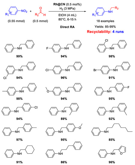 - Huang, L.; Wang, Z.; Geng, L.; Chen, R.; Xing, W.; Wang, Y.; Huang, J. Selective and recyclable rhodium nanocatalysts for the reductive N-alkylation of nitrobenzenes and amines with aldehydes. RSC Adv. 2015, 5, 56936–56941. [Google Scholar] [CrossRef]