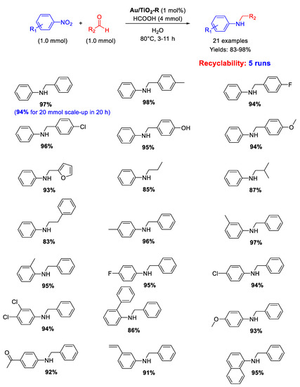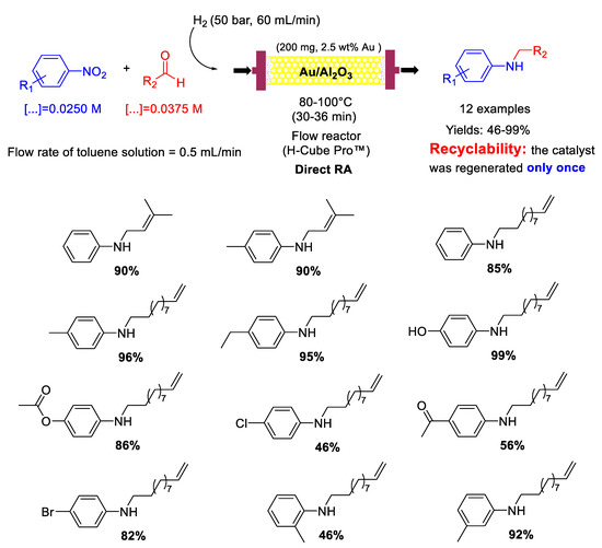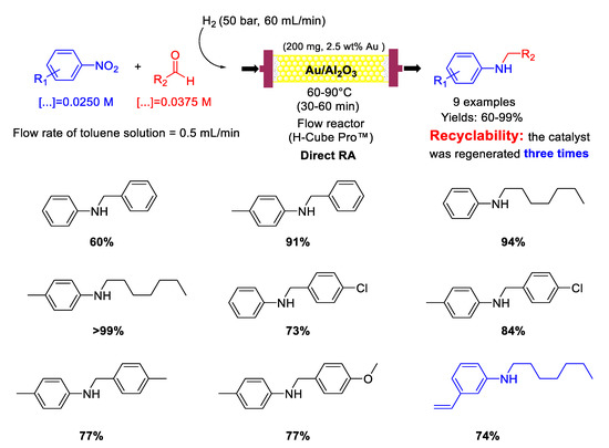 - Artiukha, E.A.; Nuzhdin, A.L.; Bukhtiyarova, G.A.; Zaytsev, S.Y.; Plyusnin, P.E.; Shubin, Y.V.; Bukhtiyarov, V.I. One-pot reductive amination of aldehydes with nitroarenes over an Au/Al2O3 catalyst in a continuous flow reactor. Catal. Sci. Technol. 2015, 5, 4741–4745. [Google Scholar] [CrossRef]