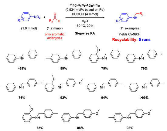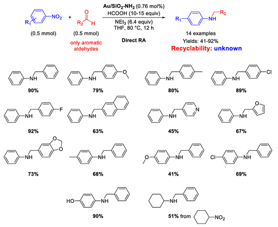 No recyclability tests have been reported. Yields ranged from 82 to 99%, being lower (52%) only by using tiophene-2-carboxaldehyde in the RA with nitrobenzene, because sulfur derivatives are known to poison noble metal catalysts (Scheme 23).