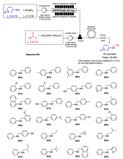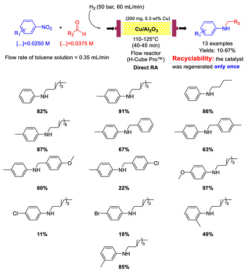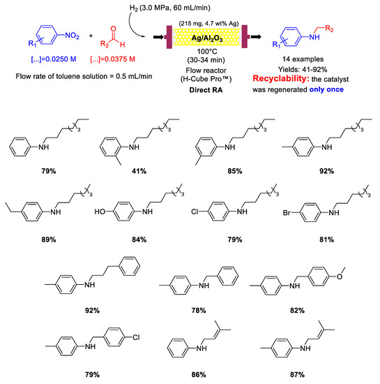 - Artiukha, E.A.; Nuzhdin, A.L.; Bukhtiyarova, G.A.; Bukhtiyarov, V.I. Flow synthesis of secondary amines over Ag/Al2O3 catalyst by one-pot reductive amination of aldehydes with nitroarenes. RSC Adv. 2017, 7, 45856–45861. [Google Scholar] [CrossRef]