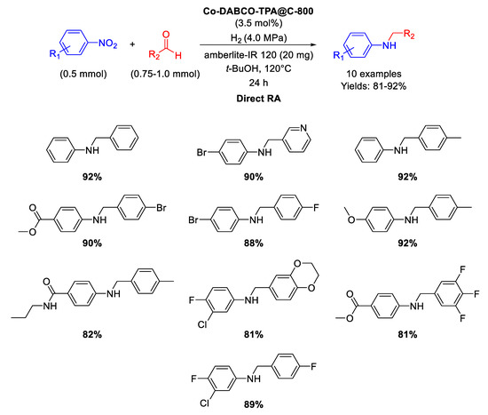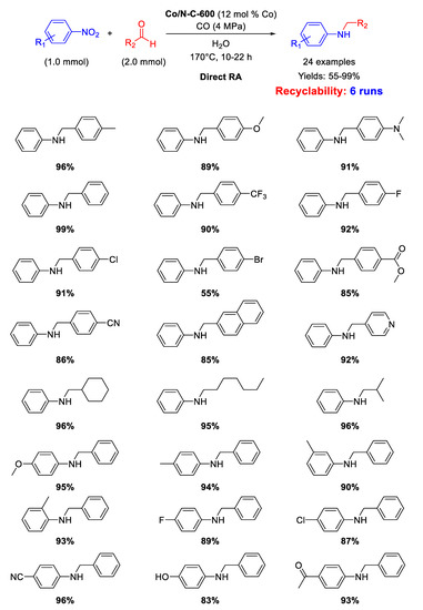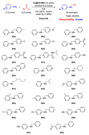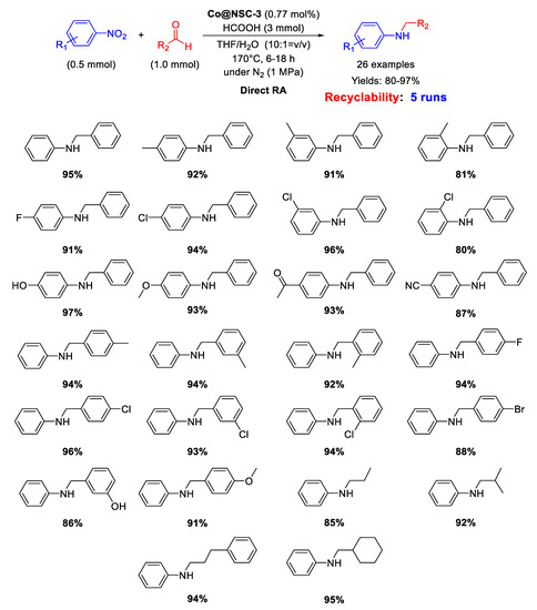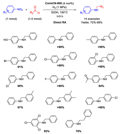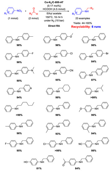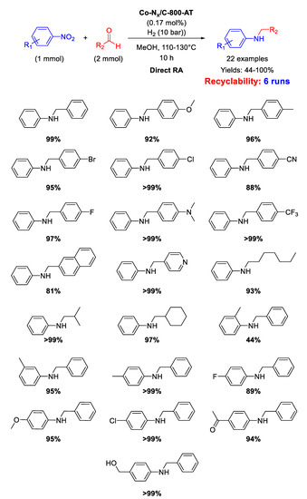 - Zhou, P.; Zhang, Z. One-pot reductive amination of carbonyl compounds with nitro compounds by transfer hydrogenation over Co–Nx as catalyst. ChemSusChem 2017, 10, 1892–1897. [Google Scholar] [CrossRef] [PubMed]
