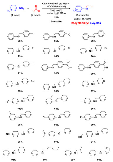 However, when formaldehyde was used, formation of substantial amounts of the corresponding tertiary amine was observed, but in this case the authors found out that a stepwise RA could be applied with satisfactory yield. No data on the recyclability of the catalyst were given.
