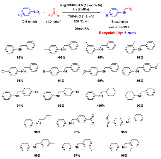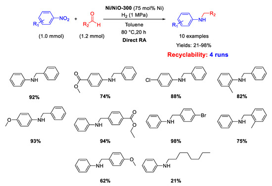 - Kita, Y.; Kai, S.; Rustad, L.B.S.; Kamata, K.; Hara, M. One-pot reductive amination of carbonyl compounds with nitro compounds over a Ni/NiO composite. RSC Adv. 2020, 10, 32296–32300. [Google Scholar] [CrossRef]