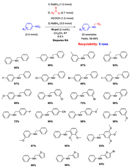 A simple and efficient stepwise RA was achieved throughout reduction of nitroarenes followed by reductive amination. Although the proposed protocol resulted chemoselective and could also be extended to ketones, neither investigations of the scope of reaction nor data on recyclability of catalyst were reported. However, in a follow-up paper [44], the same group was able to extend their protocol under excess of formaldehyde for the synthesis of tertiary amines in high yields.