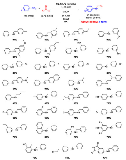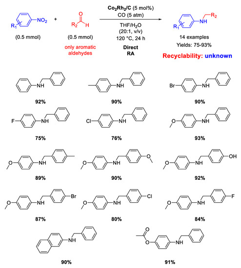 - Choi, I.; Chun, S.; Chung, Y.K. Bimetallic Cobalt–Rhodium Nanoparticle-Catalyzed Reductive Amination of Aldehydes with Nitroarenes Under Atmospheric Hydrogen. J. Org. Chem. 2017, 82, 12771–12777. [Google Scholar] [CrossRef] [PubMed]