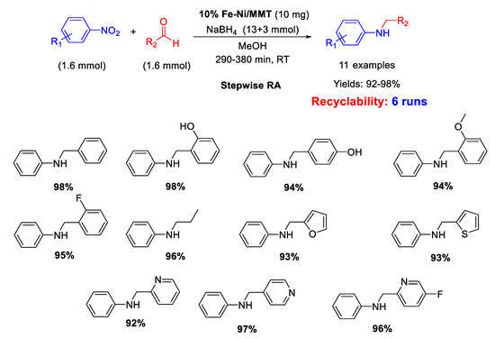 - Chikate, R.C.; Petkar, D.R.; Kadu, B.S.; Jakhade, A.P. Fe–Ni/MMT nanocomposites as efficient H2 generation catalyst: Tandem approach towards one-pot synthesis of secondary amines. Int. J. Hydrog. Energy 2020, 45, 31798–31811. [Google Scholar] [CrossRef]