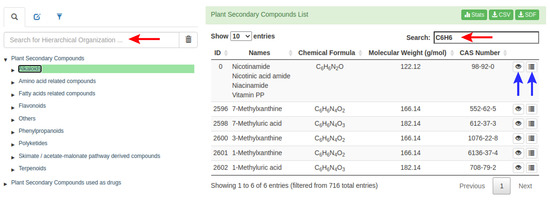 Additionally, the user can apply a second search filter within a set of compounds, using certain descriptors, such as the number of carbon atoms in a given group of pre-selected compounds. Figure 2 presents an example where all the alkaloids were pre-selected (Figure 2, left red arrow), and then a second filter was applied to select the PSC with six carbons and six hydrogens “C6H6” (Figure 2, right red arrow). As a result, 716 alkaloids were pre-selected with the first filter, and then six compounds were obtained following the second filter (Figure 2). After the final selection of the phytochemical compounds, information such as the PSC-db ID, names, chemical formula, molecular weight, and CAS number is displayed in a dynamic table, and two buttons allow the user to access more detailed information for each compound (Figure 2, blue arrows). The “eye” button allows access to the 2D- and 3D-structure, as well as a Bioavailability RADAR, calculated from the predicted ADME/Tox properties (Figure S1). The 3D representation is interactive, and the structure can be rotated to fit the user’s needs. The “list” button allows access to more detailed information on each compound such as external links associated with other databases (NIKKAJI, KNApSAcK, PubChem, KEGG, ChEMBL, and ZINC). This might be very useful. For instance, to know if one or more compound(s) are commercially available, it is possible to access the ZINC link to find the different vendors and the availability of the compound. The hierarchical organization is also indicated (Figure S2), as well as the predicted physicochemical and pharmaceutical properties calculated using SwissADME server [25] (Figure S3). Finally, the user can access to the source organism for a given phytochemical compound, as well as to its biological activity information (Figure S4). The source organism and biological activity information was retrieved from KNApSAcK and ChEMBL databases, respectively.